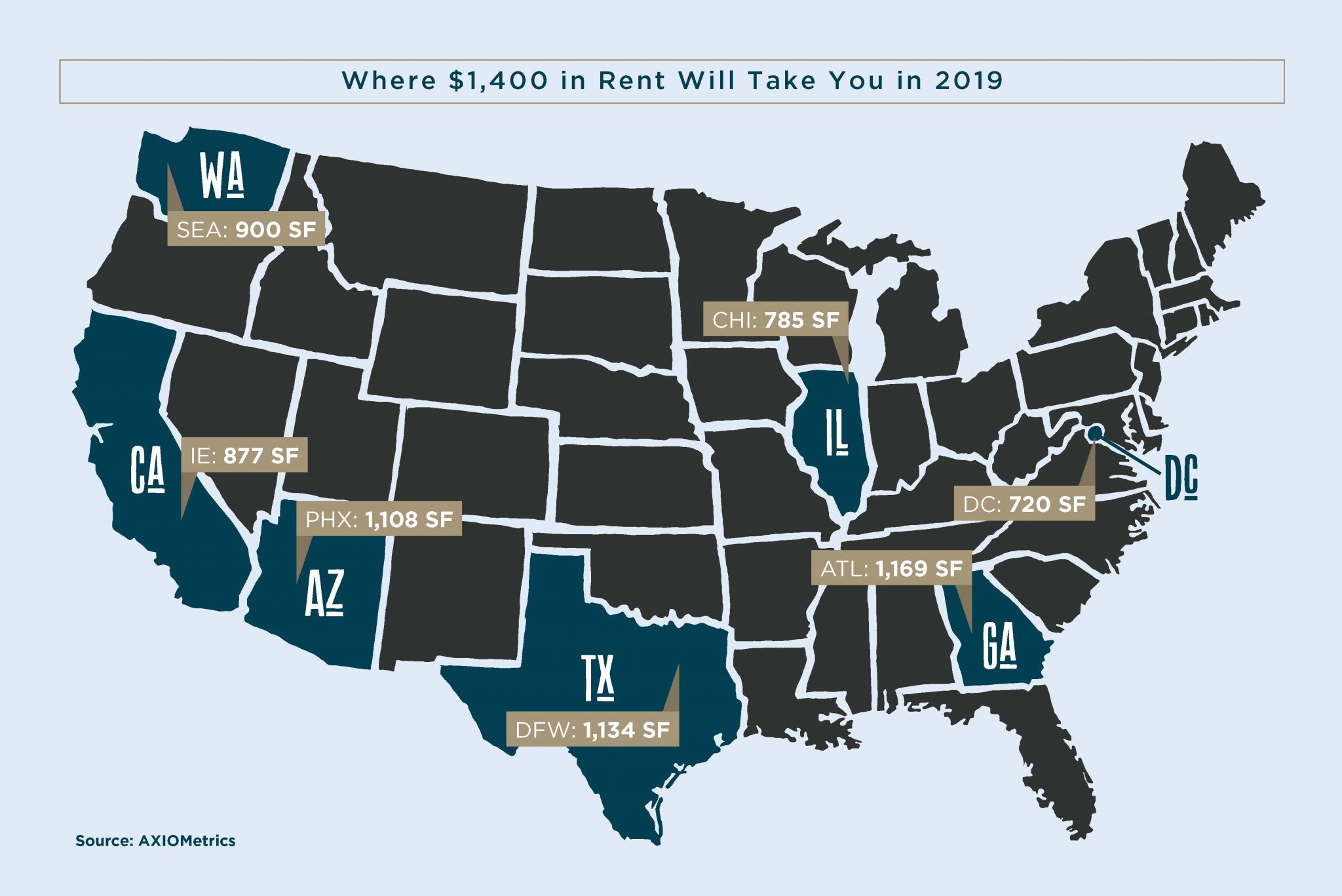In the final quarter of 2018, nationwide average rent was just under $1,400 per month. Here’s a closer look at how much rental space that amount gets you per month in seven of the most popular markets across the United States.