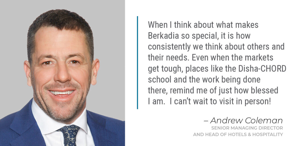 Berkadia has an extensive network of offices throughout the United States and all the Berkadians share the excitement experienced by their colleagues in Hyderabad when it comes to the school. Being a part of something this special is fulfilling and the ability to support Berkadia’s involvement in the Disha-CHORD school, in myriad ways by volunteering, donating or spreading the word is invaluable. Andrew Coleman, Senior Managing Director and Head of Berkadia Hotels & Hospitality, pledged a generous multi-year financial commitment that played a major role in moving forward with the new school. Andy said, “When I think about what makes Berkadia so special, it is how consistently we think about others and their needs. Even when the markets get tough, places like the Disha-CHORD school and the work being done there, remind me of just how blessed I am. I can’t wait to visit in person!”