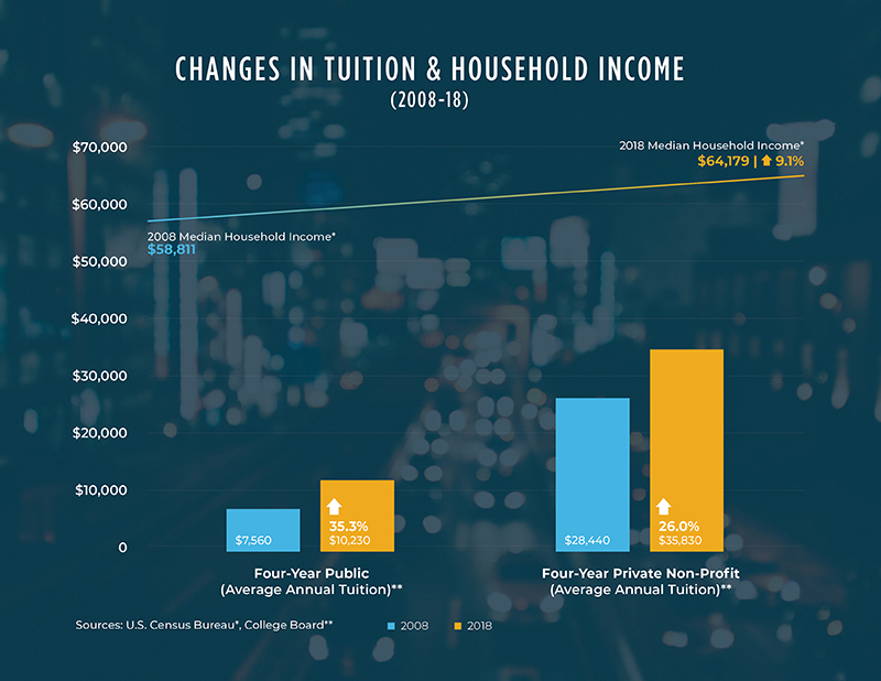 - Rising Tuition Costs – The simple reality is that income growth for most Americans has trailed the rapidly increasing cost of college tuition. While household median incomes expanded by over 9% from 2008 to 2018, the cost of annual tuition rose nearly three times as quickly. Over the same period, four-year public institutions increased tuition over 35%, while tuition at private/non-profit colleges rose 26%, according to the College Board.