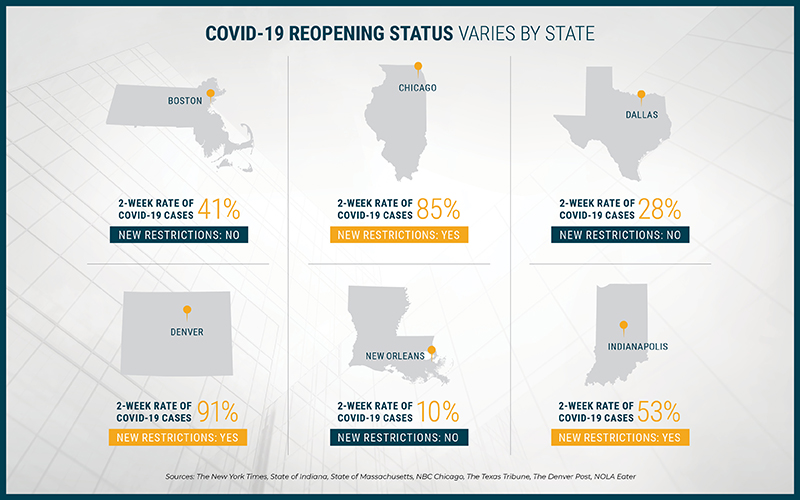 The fast pace of economic recovery is beginning to wind down as pandemic relief talks remain at a halt, and COVID-19 cases are beginning to resurge in different parts of the country. In some states and metros, plans to begin a new round of tighter restrictions on businesses are already underway or are in discussion.